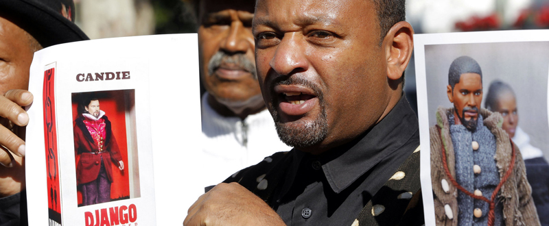 Pictured above, community activist Najee Ali holds an action figure depicting Calvin Candie, Leonardo DiCaprio’s character from the Quentin Tarantino film Django Unchained, during a news conference Tuesday Jan. 8, 2013 in Los Angeles. He (and others) have called for the “offensive” action figures to be taken off the market.